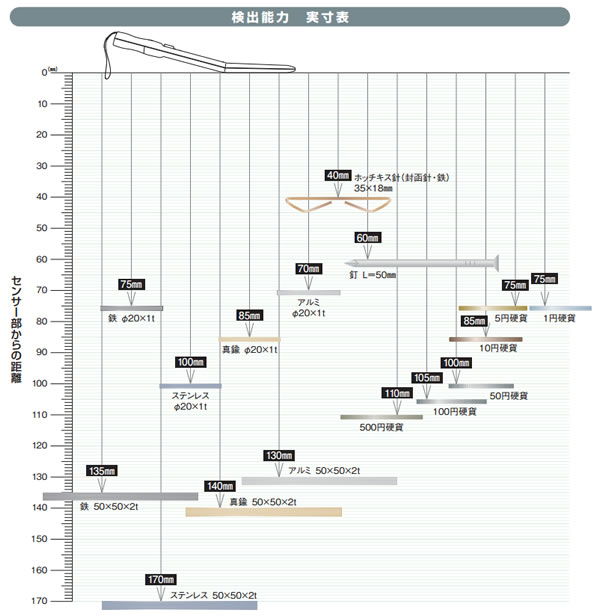 ※2. 鉄(50×50×2t)をセンサー部から135mmの距離まで検出。 ■検出能力 実寸表 ![]() ■銅管の探知距離 ![]() |