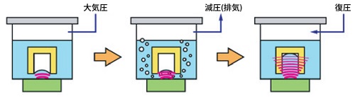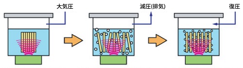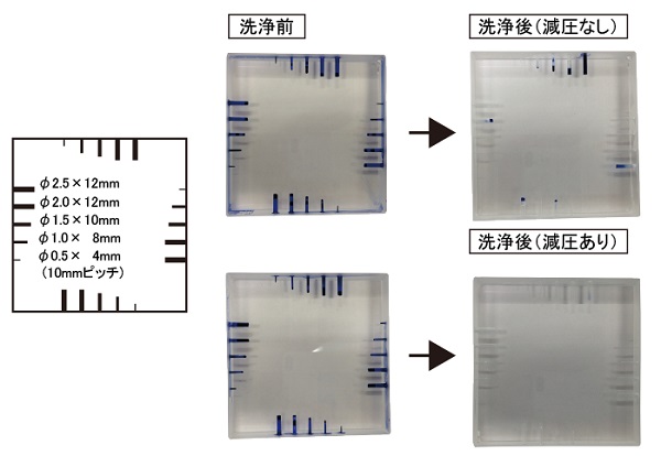 従来の超音波洗浄機では、洗浄しきれなかった微細孔・袋穴の洗浄可能 超音波洗浄機の洗浄要素であるキャビテーションがパワーアップされます。 減圧と常圧を自動で繰り返すため、汚れの剥離がスピーディーです。 |