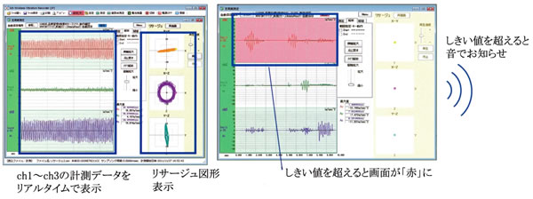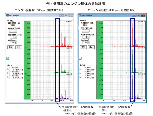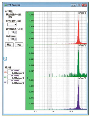 ●振動変位解析ソフトウェア 装置等の振動をわかりやすい「変位」に変換! 加速度データのフィルタリングも可能です。 ![]() ■データ解析方法紹介 ●振動の大きさから故障の予防診断を行う~加速度最大値確認 MG5VPRF-3-HMでは、加速度の最大値は計測終了後自動的に表示されます。 一般的に振動する装置は故障前に振動=加速度レベルが大きくなる傾向があり、 予防診断の指標として効果的な場合が多くあります。 ![]() ●振動の周波数成分を解析して振動発生の原因を知る~FFT解析 振動発生の周波数を知ることで、振動発生の原因が特定できる場合が多くあります。 MG5VPRF-3-HMでは、標準添付のソフトウェアにて簡単にFFT解析が可能です。 ![]() 計測部分は、エンジン回転数にかかわらず、回転数の約2倍の周波数の振動成分が最も大きい。 →振動は、エンジンの回転振動機構のいずれかから発生していると推察できる。 ●三次元の振動を3つの二次元平面上に「見える化」する~リサージュ図形 三次元同時計測だからこそできる、「振動モードの見える化」 加速度の最大値やFFT解析の値が変わらないのに、装置の精度が変化しているというような場合、 リサージュ図形を観察してみてください。 ![]() ●振動の「変位量」を算出する~振動変異解析ソフトウェアMG5VP-VD-SM(オプション) 装置等の振動加速度をわかりやすい「変位」に換算表示します。 また、ローパスフィルタ、ハイパスフィルタ設定機能も搭載しているので、 フィルタリングにより、欲しい振動データを抽出することも可能です。 ![]() ![]() |