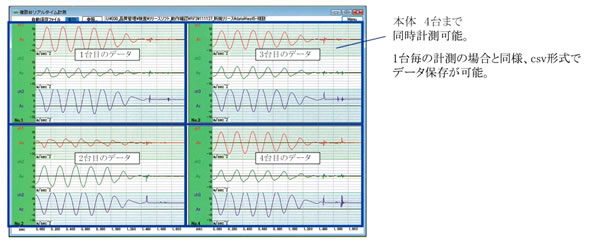 | ■3つのコンセプト 1.3軸加速度センサを内蔵し、最大4kHzまでのサンプリングが可能!本体1つで簡単に振動計測が可能です! 2.4台まで同時計測可能!最大12チャンネルのデータロガーとして使用可能です! 3.外部センサも接続可能で様々な計測シーンに応用可能!豊富なオプション品もご用意! 少しずつシステムアップが可能です! ![]() ※コンピュータは付属しておりません。 ■応用例・適用例 ●装置振動計測分野 ・半導体ウェハ、液晶パネル搬送時の振動モニタリング 無線計測だから、搬送装置の振動を余すことなく簡単計測 ![]() ・モーター、ポンプなどの振動計測 FFT解析でモータやポンプの異常振動の原因解析も簡単! ![]() ・計測メイン画面 ![]() ■標準付属ソフトウェア計測/解析機能 ●リアルタイム波形表示/異常お知らせ・アラーム機能 ![]() ●FFT解析 ![]() ●データ保存(csv形式) ![]() ・csv形式でデータ保存すると市販の表計算ソフトウェア等を用いグラフ作成や各種解析などが可能。 ・「自動保存機能」を用いると、長時間連続データの記録も可能。 ●複数台同時計測/データ保存 ![]() ■外観寸法図 ![]() ![]() ■仕様
