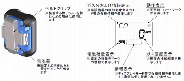| ■特長 ・繰り返し使用できる充電池仕様 ・キズや汚れ、衝撃から本体を守るプロテクトカバーが標準付属 ・作業時に邪魔にならない小型、軽量デザイン ・危険場所でも使用可能な本質安全防爆構造 ■用途 ・作業員ひとりひとりの周囲の安全確認に ・ガスメーターの点検、工事の際の一酸化炭素中毒事故防止 ■使用例 ■各部の名称と働き ■外観、表示部 ■仕様