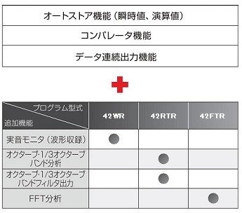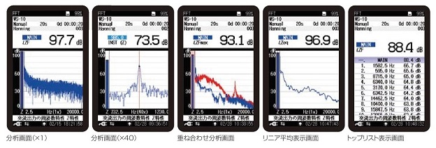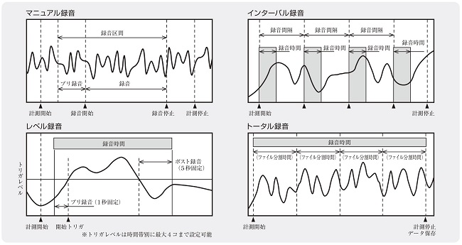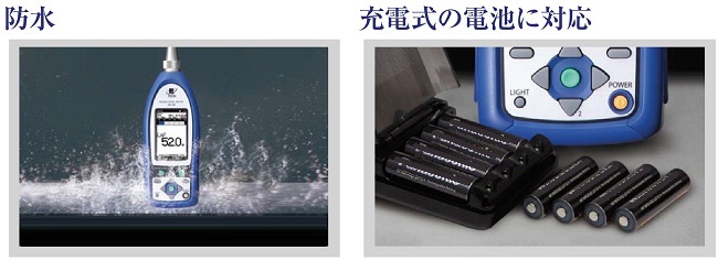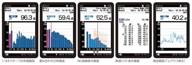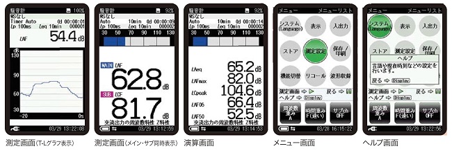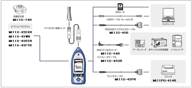 | 使いやすさにこだわり、計測中にマニュアルを確認しながらというわずらわしい作業を無くしました。 画面は大きく見やすい3インチのカラー液晶。 突然の降雨にも耐えうる防水性能をプラス。 ![]() ■特長 ●大きなカラー液晶画面 3インチ液晶画面のタッチパネル式。屋内・屋外・暗所でも見やすい高画質 ![]() ●マニュアルが不要 日本語によるメニュー表示。画面の誘導に従い簡単操作 ![]() ●防水 防水性はIP54(マイクロホン部を除く)、突然の降雨などによる故障を低減 ※全天候ウインドスクリーン、防雨型ウインドスクリーンを装着するとマイクロホン部を含め、 ●充電式の電池に対応 充電式の電池に対応し環境にも配慮。 24時間の連続測定を実現(アルカリ乾電池使用時) ![]() ●1ヶ月間の連続測定 環境計測などの長期間計測に対応(ACアダプタ使用時) ●豊富なオプションで機能を拡張 長時間のデータを録音、周波数分析機能を追加 ・1/3オクターブバンド分析表示 ・FFT分析表示(x40) ・ソフトウェア(MI11S-60R)によるデータ管理表示 ■オプションプログラム機能一覧 オプションプログラムをインストールすると以下の機能が追加されます。 【機能拡張プログラム(MI11X-42EXR)】 インストールするとMI11X-42WR、MI11X-42RTR、MI11X-42FTRを追加することができます ・MI11X-42EXRは512 MBのSDカードで供給します。インストール後は512 MBのSDメモリカードとして使用可能になります。 ・オートストア機能(瞬時値、演算値) ・コンパレータ機能 ・データ連続出力機能 + ・実音モニタ(波形収録) ・オクターブ・1/3オクターブ バンド分析 ・オクターブ・1/3オクターブ バンドフィルタ出力 ・FFT分析 ![]() ※インストールしたMI11X-42EXRはアンインストールすることはできません ●オートストア機能 ・Lpモード(瞬時値)、Leqモード(演算値)の連続記録が同時に行えます ・オートストア総測定時間:最長1000時間 タイマ機能付き ・Lpモード(瞬時値)、Leqモード(演算値)の概念 ![]() ●コンパレータ機能 オープンコレクタ出力(最大印加電圧24 V、最大電流60 mA、許容損失300 mW)で設定レベルを超えるとONとなります ![]() ●データ連続出力機能 USBおよびRS-232C通信において、瞬時値・演算値を連続取得できる機能です 表示器など制御プログラムをご自身で組まれるお客様に便利です 【波形収録プログラム(MI11X-42WR)】 ・2 GBのSDカードで供給します。インストール後は2 GBのSDメモリカードとして使用可能になります。 ・騒音レベルの演算と同時に録音することが可能 ・録音したデータは、コンピュータで再生が可能で、周波数分析にも対応(非圧縮波形WAVEファイル) ・48 kHz、24 kHz、12 kHzサンプリング。 24 bitまたは16 bitから選択 ・最大収録時間(16 bit時) ![]() 録音の概念 ![]() 【オクターブ・1/3オクターブ実時間分析プログラム(MI11X-42RTR)】 ・512 MBのSDカードで供給します。インストール後は512 MBのSDメモリカードとして使用可能になります。 ・MI11L-52RK/45RKにプログラムを追加することで、オクターブバンド・1/3オクターブバンド実時間分析が可能です。 ・保存された分析結果を読み出し、分析中のグラフと重ね合わせ表示することも可能です。 また、NC曲線のグラフ表示やNC値を計算・表示する機能も備えます。 ・MI11AS-60RTRを使用し、コンピュータで再演算やデータ管理が可能です。 ![]() 【FFT分析プログラム(MI11X-42FTR)】 ・512 MBのSDカードで供給します。インストール後は512 MBのSDメモリカードとして使用可能になります。 ・このプログラムを追加することでFFT分析が可能になります。 ・分析周波数範囲は20 kHz、スペクトルライン数は8 000ライン(表示は200ライン)です。 ・保存された分析結果を読み出し、分析中のグラフと重ね合わせ表示することが可能です。 ・ズーム倍率は最大40倍、トップリストは20まで表示可能です。 ![]() ■接続構成例 ![]() ■仕様
