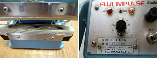 手軽なハンドル操作で約100kgの強力なシール圧力が発生し、上下加熱方式による高い温度のヒーター発熱で単体袋から厚手ガゼット袋、お茶袋、コーヒー豆袋、紙などのラミネート袋まで幅広く対応します。 | 中古富士インパルスシーラー茶袋用 品番 FI-130 問い合わせ番号 Z-0718-2 完売 |