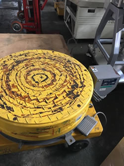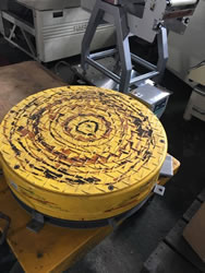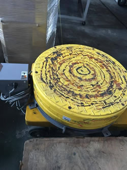 | ■特長 モーターを組み込んだ電動式ターンテーブル。 手動ではどうしても解決できない自動回転を必要とする作業、例えば、ストレッチ梱包作業やコンベアラインの方向転換など本器で解決して下さい。 ■使用用途例