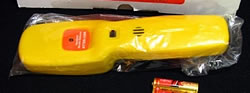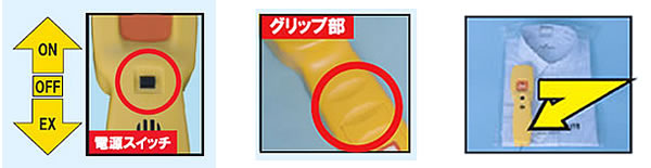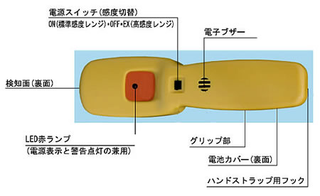 | ■特長 ●検知感度を選べます。 電源スイッチは中央位置が「OFF」、前方へスライドすると標準感度レンジ「ON」で、手前にスライドすると高感度レンジ「EX」で電源が入ります。 感度レンジと検知距離については下記の「感度レンジと検知距離で説明しています。ご参照ください。 ●バランスが良い。 形状とウエイトバランスを考慮し、長時間の検診が容易になりました。 ●省電力設計です。 新開発の電子回路が高感度で省エネを実現しました。 ●警報はブザーとランプです。 ブザーは小型軽量で大音量です。 音の高さは良く聞こえる周波数に設定してあります。 同時に赤色LEDが点灯します。 ●電池交換の時期をお知らせします。 電池交換のタイミングをブザーの連続音と、LEDランプの点滅でお知らせします。 ●RoHS指令対応品(鉛フリー)です。 地球環境対策の一環として、欧州ではすでに政令化されている基準に対応しています。 ■使用方法
