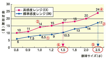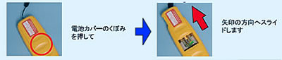 手前にスライドすると「EX」で、高感度レンジです。このレンジは、特に微小鉄片を検知したい場合に使用します。 金属部品があったり、製品そのものに金属反応がある場合、検査品によっては高感度の「EX」では検知動作をしていまうことがあります。この場合は、標準感度の「ON」でお使いください。 (2)電源を入れて、検査を始める前に適当な金属に近づけ、が「ピピピー」と正常に動作することを確かめてください。 検査を終了する時も同じように正常に動作することを確かめ、それまでの検査が正常に動作していたことを確認してください。 検査終了時に異常であれば、全数再検査をお勧めします。 (3)検針器のグリップ部をしっかりと握り、検知面で検査物の上をアイロンをかける要領で動かしてください。 (4)針(鉄片)を検知するとブザーとランプでお知らせします。 針を見つけると電子ブザーが鳴り、LEDランプが一段と明るく点灯します。複数の針が同じ場所に残っている場合があるため、針を抜き取った後、再度検針をお勧めします。 <注意> ●本器は原理上、静止した状態では検知動作をしません。金属の移動速度が速いほど起電力が大きくなり、小さな金属を検知します。 必ず前後左右に、50cm/秒程度の速度で動かしてご使用ください。 手の指を広げると20cm位になります。この距離を1秒で往復する速度を検査速度の目安にしてください。 ※シャツなどの衣類はおよそ1秒間に1往復程度。 ●検知距離は、2.5φ鉄球の場合、標準レンジで最大17.0mm、高感度レンジで最大24.0mmです。 本器と検査品の距離が離れると検知できませんので、必ず検知面で検査箇所をなでるようにしてご使用ください。 ※ここでは標準的な検査動作を記載していますので、社内規定がある場合は、規定に従ってください。 ■電池交換の時期 電池がなくなってくると、ブザーが連続して鳴り、LEDランプの点滅が続きます。電池を交換してください。 <電池の交換方法> 1)電源スイッチをOFFにします。 2)本器裏面の電池カバーをスライドして外します。 電池カバーのくぼみを押してスライドすると、外しやすくなります。 3)古い電池を取り出し、電極マーク「+-」を確認して、新しい電池を入れます。 4)電池カバーを元の様に取り付けます。 ![]() ■用途 生産工場での品質管理・店頭などでの防犯管理。 ・縫製品全般(婦人服・子供服・ベビー服・紳士服・きもの・ぬいぐるみ・毛皮製品)に 混入した鉄製の縫い針、折れ針、マチ針、ピンなどの検出、検針。 ・コンベヤー式検針機、大型検針機で検知された商品の中の部分検針と針位置確認。 ・製品内に混入した縫い針、ホッチキス、鉄釘などの検出。 ・医療関係での体内侵入針などの検査、MRI検査(核磁気共鳴撮影)前の鉄片装着検査での使用。 ■感度レンジと検知距離 グラフの青線は標準感度レンジ(ON)、赤線は高感度レンジ(EX)における各鉄球の検知距離を示しています。 ![]() ●標準感度レンジ(ON)では、1.0φ(直径1.0mm)の鉄球を検知面から8.5mmの距離まで(@)、2.5φ(直径2.5mm)の鉄球を17mmの距離まで(A)検知します。 ●高感度レンジ(EX)では、1.0φ(直径1.0mm)の鉄球を検知面から14mmの距離まで(B)、2.5φ(直径2.5mm)の鉄球を24mmの距離まで(C)検知します。 ●高感度レンジ(EX)では同じ距離でより小さな鉄球を検知します。 検知面から17mmの距離の場合、標準感度レンジ(ON)では2.5φ(直径2.5mm)の鉄球を(D)、高感度レンジ(EX)では1.5φ(直径1.5mm)の鉄球を(E)検知します。 ※金属部品があったり、製品そのものに金属反応がある場合、 検査品によっては高感度の「EX」では検知動作をしてしまうことがあります。 この場合は、標準感度の「ON」でお使いください。 ■各部の名称 ![]() ■仕様