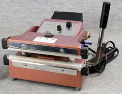 手軽なハンドル操作で約100kgの強力なシール圧力が発生し、上下加熱方式による高い温度のヒーター発熱で単体袋から厚手ガゼット袋、お茶袋、コーヒー豆袋、紙などのラミネート袋まで幅広く対応します。 | 中古富士インパルス茶袋シーラー 品番 FT-230 問い合せ番号 Z-0729-6 完売 |