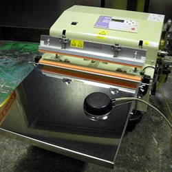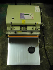 | ■標準装備 理想的な加熱温度を設定・維持することができる加熱温度コントロール機構のことで、 ・加熱温度の変化によるシールミスが許されない場合 ・長時間の連続使用、量産される場合 ・シール精度・強度が常に一定であることが要求される場合 の用途に活躍します。 薄型温度センサー(熱電対)をヒーターに接触させ、ヒーター温度をダイレクトに検出し制御します。作業場環境(気温)の変化や長時間の使用による機械温度の上昇などにより設定したシール条件が変化することがありません。 「理想的な加熱温度」=「フィルムが溶ける温度」に加熱温度を設定することができますので、シール強度を向上させることができます。また、シール加熱・冷却に無駄がないので省エネルギー・高作業効率であるとともにヒーター、テフロンなどの部品寿命を長くします。 ■高い真空度 内蔵の真空ポンプは排気速度80g/分 到達真空度-96Kpaの高い真空度を得られます。 注)排気速度・到達真空度は、機械に組み込んでいない状態で計測した数値です。 到達真空度は0torrを-101.3paとしています。 コンパクトサイズ 排気エアにより駆動シリンダーを作動させ、吸気口から真空排気を行うコンプレッサーポンプを使用して、本体ボディのコンパクト化を図りました。また、ドライポンプを搭載していますのでクリーンな排気で作業場環境を悪化させません。 ■安全装備 シール加熱時に設定時間以上の通電があると自動的にOFFになる加熱防止回路付漏電ブレーカーを標準装備しています。 ■冷却時間設定に関する注意 加熱温度設定範囲60〜250℃冷却温度設定範囲40℃〜加熱温度設定値の範囲で設定可能ですが、冷却時間は必ず加熱温度より低い数値で設定して下さい。 加熱温度に近すぎる数値に設定すると冷却されず、テフロンなどの部品寿命が短くなります。 ■仕様