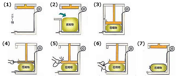 圧縮減容梱包機とは、工場や倉庫などで発生するかさばる廃棄物等を扱い易くするために圧縮減容する機械です。