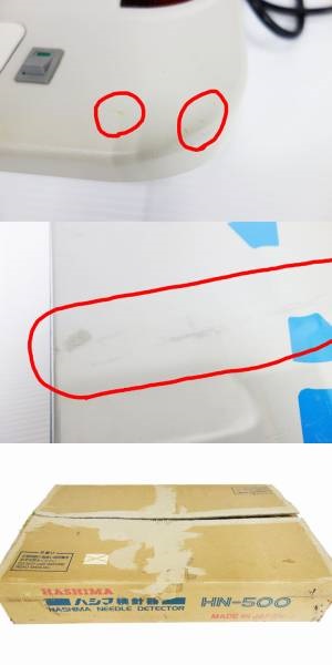 | ●商品名 HASHIMA HN-500 ポータブル検針器 ●音と光で針などの金属を検知したことを知らせます。 ●検知方式 磁気誘導方式 ●寸法 400(W)×680(D)×70(H)mm ●電源 1P100V ●購入したときは、20万近い値段でした。 ●操作パネルに検知位置の表示がありますので、折れ針の位置確認が簡単、確実にでき、安心して検針出来ます。 感度調整は6段階に切り替えができますので、服飾付属品の大小、種類により、簡単な操作で設定出来、縫製品に混入した折れ針、忘れ針等の検出を確実にします。 ■用途 婦人服。子供服・紳士服など、縫製品に混入の金属片(鉄製)の検出。 ■仕様