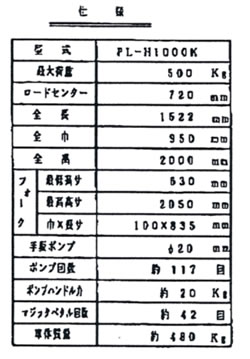 能力500kg ●工場でのプレスの金型、治具等の脱着、機械等の積揚げ積降しに。 ●早揚り装置付。 ●強力な足踏みブレーキ付。 ●安全性重視の自動積荷チェックバルブ装置内蔵。 |