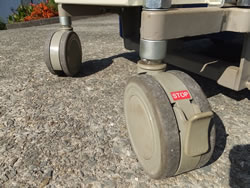 | ■特長 ●早揚り機構(自動切替・内蔵) 無負荷(軽負荷)時はテーブル(フォーク)の上昇スピードが2~3倍になり、作業効率がアップ。 一定の荷重を超えると、通常スピードに自動切替になる安全設計です。 ![]() ●双輪キャスター(標準型) 走行・旋回を同時に止めるストッパーを装備。車輪はエラストマーゴムを採用し、床をキズつけないクリーンでやさしい 材質です。 ![]()