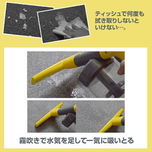 | ■概要 カ水が吸える掃除機、もちろんチリやホコリもOK。 ウェット&ドライ両用のオールマイティに活躍できる充電式ハンディクリーナーです。 充電式だからコードレスで煩わしさなし。使いたい時にすぐ使えます。 こぼしてしまった飲み物も、水浸しになってしまう窓掃除も、水滴でカビちゃうお風呂の壁も、トイレじゃないところでしてしまったペットのおしっこも、水が吸える掃除機だから様々なシチュエーションで大活躍。 そして、掃除には便利な霧吹きスプレーがハンディクリーナーと一体化されており、たくさんの掃除用具は不要で、とってもお掃除が楽になります。 もちろん、ウェット&ドライ両対応だから、ホコリやチリなど普通の掃除機としても使えます。 充電式のハンディクリーナーでは、長時間の連続使用時間約30~40分。 広々吸水できるワイパーノズルと、細かい箇所を吸えるすき間ノズルが付属します。 ![]() ■こんな時に大活躍!! ●テーブルや机、床にこぼしてしまった飲み物をスイトル ![]() 「あっ!こぼしちゃった!」テーブルや床に飲み物をこぼしてしまっても焦らなくて大丈夫。 サッ!とM1080AEN-5RSの電源ボタンをポチッと押して吸いとってしまいましょう。 ティッシュで拭いてゴミを出したり、雑巾で拭いて洗ったり拭いて洗ったりなんてことがなくなります。 ●絨毯やカーペットにこぼしてしまった柔らかな固形物をスイトル ![]() ヨーグルトやプリン、ゼリーなどの柔らか固形物も、サッ!と吸い取る。 大きなものはティッシュでつまんでポイ。シュッと霧吹きスプレーで水をかけて吸いとり力UPで、ティッシュや雑巾で何度も拭き上げる必要がありません。 ●ペットのおしっこをスイトル ![]() トイレじゃないところにしてしまって大慌て。そんな時にもサッ!と吸い取る。 洗剤や脱臭剤を含ませた水をシュッとスプレーして、楽々お掃除。 ●窓掃除の汚れや結露をスイトル ![]() 窓ガラスを洗剤拭きや水拭きしたあと、乾拭きすると拭きあとが残って、綺麗にしたのに汚く見えてしまう…。結露をスクイジーで水を切ると、下に水が垂れてビチャビチャ、雑巾も余計に用意しないといけない…。 そんな時、サッ!とM1080AEN-5RS!水垂れせず、綺麗に窓掃除。 ●お風呂の壁の水滴をスイトル ![]() お風呂のカビが気になるけど、毎回水滴を拭き上げるのは大変。 そんな時に、サッ!とM1080AEN-5RS!電動でグイグイ水滴を吸いとります。 ●ゴムワイパーで広く吸引力UP ![]() ゴムワイパーの吸水ノズルで、広く接地面と密着して吸引力をUP。 吸い込めるダストカップの容量は約160ml。 ■特徴 ●霧吹きスプレーが一体化してるからお掃除がより楽ちんに♪ 洗剤を入れた水など入れておける、お掃除に便利な霧吹きスプレーが、 M1080AEN-5RSと一体化しているので、コレ1つで洗浄して汚れを吸いとることができます。 ![]() ●霧吹きタンクは持ち手から入れてトリガーを引いてシュッ 霧吹きタンクには、持ち手の下にあるキャップを外して、水や洗剤水をいれます。 トリガーを引けば、タンク上部から噴霧します。 ![]() ●こんな時に使うと便利 ヨーグルトやジャムなど、こぼしてしまったとき、ティッシュのゴミは多くなるし、拭きとると余計に拡げてしまうことがあります。そんな時に、霧吹きで水気を足して、吸いとりやすくします。 ![]() ●充電式コードレスだから使いたい時にすぐ使える 充電ケーブルを繋いで約3時間で満充電。コードレスだから、サッと持って高い位置の窓や狭い場所でも煩わしさなしで使えます。 連続使用30~40分と充電式ハンディクリーナーでは長時間の使用が可能です。 充電中は霧吹きのタンクが赤く点滅、充電が完了すると青く点灯します。 ※充電ケーブルを繋げながらは使用できません。 ![]() ●チリやホコリも吸いとるドライクリーナー ウェット&ドライ両用だから、普通の掃除機としても使えます。 先端が細いすき間ノズルに変えれば、狭い場所や細かい場所のゴミも吸いとれます。 ![]() ■サイズ ![]() ■仕様