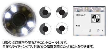 | ■主な特徴 ●レンズ性能の向上による圧倒的な高画質 M1080TZH-D7515MSに搭載されたレンズは、最先端のレンズ設計により、非常にシャープで収差が少なく周辺光量の低下が小さい、圧倒的な高画質をすべての拡大率範囲にわたり実現します。 ●レンズキャップの付け替え可能なデザインより、全倍率域の利用が可能 M1080TZH-D7515MSでは、着脱や交換が可能な先端部アタッチメント(フロントキャップ)のデザインを採用。アタッチメントを取り外した状態では、全ての拡大率範囲にアクセスでき、アングルの自由度も高まります。 ●アタッチメントを標準装備 通常用アタッチメント以外にも、3Dイメージ用、低倍率用、デフューザー用、クローズ用などを標準で装備。撮影の幅を広げます。※使用可能なフロントキャップや同梱されるキャップは、機種により異なります。 ●WB(White Balance)コントロール機能 ●画素数1.3Mの新センサー採用 ■機能について ●同軸照明機能 ![]() ●フレキシブルLEDコントロール機能 ![]() ●自動倍率読み取り機能 ![]() ■M1080TZH-D7515MSの主な機能 ●豊富な測定機能 静止画だけでなくビデオも距離測定可能です。 豊富な描画ツール(6種類)と測定ツール(11種類)が使えます。 ●充実した表示機能 観察画面や撮影画像に、グリット線、グリッド円、十字線、自由に移動できるスケール付きの十字線、固定長、なげなわ、色平均、が表示可能。 対象物のレイアウトや測定に便利です。 ●複数のM1080TZH-D7515MS同時使用と管理機能 最大8台までのM1080TZH-D7515MSを一台のPCに接続、それぞれのウインドウで起動可能です。 研究の効率やスピードアップに貢献します。 ●キャリブレーション機能 キャリブレーションを利用することにより、より高精度での測定ができます。 キャリブレーションのプロファイルは、モデル別や倍率別に複数作成可能なので、状況に応じで正確な測定が可能です。 ●使い易いインターフェース メニューのアイコン化により使い易い直感的なインターフェースを実現。 画面表示やメニューは完全日本語化。 数十ページに及ぶ詳細な日本語マニュアルをヘルプメニューに内蔵しました。 ●自動露出と自動画質コントロール 自動露出に加え、より高度な自動画質コントロール機能を搭載。 実際の色により近い自然な色合いを表現します。 ●デジタルズーム モニター上のライブ画像をワンタッチで拡大(2倍)することができます。 これにより拡大率を実質2倍に引き上げることができます。 ●撮影の幅を広げる交換可能な先端部アタッチメント 付属キャップ① 先端が閉じたキャップです。埃や湿気などからレンズやLEDを保護します。 付属キャップ② 通常の使用に使います。 ![]() ●ワンタッチ撮影ボタンを搭載 ボディにあるタッチ式スイッチにより、パソコンに触れることなく、画像を記録することができます。 ボディを手持ちの状態で、そのまま撮影できるので、チャンスを逃しません。 ●画期的な新機能を搭載した高機能ソフトウエアを付属 モニター上で観察したり、動画や静止画として保存できます。 対象物の大きさや角度などを測定する様々なツールや、自動距離測定、自動判別、IPカメラ、バーコード読み取り、など先進的な機能を備えます。 またキャリブレーション(較正)により測定精度を高めることができます。 ■Windows M1080TZH-D7515MS用ソフトについて ●フォーカス補助機能 最適なピントの位置を知らせる機能です。 焦点が合ってくると画面右下のフォーカスバーの高さが上がります。 バーの高さが一番高い所が合焦位置です。 焦点の合う位置が肉眼では分かりにくい対象物でも、最適な焦点位置を教えてくれるので、容易にシャープな画像が得られます。 ●ヒストグラム表示 AE(自動露出)のメニューに、デジタル画像の露出やコントラストを判断するうえで大変便利なグラフ、「ヒストグラム表示」が追加されました。 ヒストグラムの状態を確認しながら、露出が調整できるので、意図したとおりの画像が得られます。 ●フレキシブルLEDコントロール機能 LEDの点灯場所を自由に選択できます。 これにより、自在なライティングが可能となり、対象物の陰影を際立たせることができます。 また、LEDの明るさをコントロールできます。 ●自動倍率読み取り機能 ダイヤルの倍率を変更すると、それに追随して、自動的に画面上の倍率が変更される機能です。 倍率を変更すると自動的にリアルタイムでその倍率がソフト上に反映されます。 測定の精度や効率が向上します。 ●自動距離測定機 表示中の画像や撮影した画像のエッジを検知し、エッジ間の距離を自動計測。 エッジ検知基準を変更することで様々な状態の被写体に対応可能です。 設定は保存できるので、連続測定も楽々。 ●自動判別機能 自動計測された距離データに対して判別のルールを設定できます。 例えば、製品検査で製品の大きさが設計精度内に収まっているかどうか、製品を画面に表示させるだけで、一瞬で判別が可能で