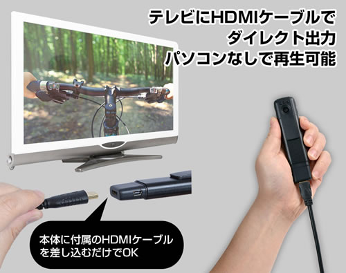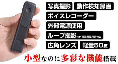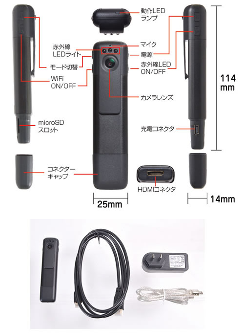 ■概要![]() カメラの映像を離れた場所でもスマートフォンでチェックできる! ワイヤレスで映像をリアルタイム表示・録画できる小型のスティックタイプカメラです。 専用のアプリを使用する事で、Wi-Fi接続でご自分のスマートフォンでカメラの映像をチェックできます。 赤外線LED内蔵なので夜間の撮影もOK。 付属のHDMIケーブルを使用して、大型ディスプレイに表示させることもできます。 コーデックはH.264。高画質ワイドダイナミックレンジ機能搭載。 重さはわずか50gと超軽量で小型。ポケットに入れておけば邪魔になりません。 高性能で非常に使いやすい小型カメラなので、防犯や子供の見守りなどでお役に立ちます。 ■カメラの映像をスマホで確認 ![]() 通常小型カメラは映像を確認するディスプレイが付いていません。 撮影後にパソコンなどで映像を見る事になりますが、 撮影が失敗していたり、もうちょっと上の方を撮りたかったなぁと思っても 撮り直しできない場合もありますよね。 やっぱり撮影中に直接映像を見て確認したいと思いませんか。 このカメラは専用アプリを使用する事で、自分のスマートフォンで直接映像を確認できます。 本体のWi-Fi設定後アプリを立ち上げれば、すぐにスマートフォンがモニターに! カメラに触れる事なくスマートフォンで動画撮影、サイズの設定にデータの確認などが出来てしまうので 驚くほど使いやすいカメラなのです。 ■フルHD撮影可能、超軽量なのに高画質録画が可能 ![]() このカメラはフルHD動画が撮影可能、コーデックはH.264。 ワイドダイナミックレンジ機能搭載の高画質撮影ができるカメラです。 WD(ワイドダイナミックレンジ)機能とは、明暗差が激しい画像を自動的に処理し、 明るいところは抑え、暗いところは明るく処理して、見やすい画像にする機能の事です。 例えば逆光の場合、太陽を背にした人物の表情は暗くなってしまいます。 WDR機能があると逆光の場合でも、表情がはっきりわかる映像になります。 ![]() 本体下部には対応テレビに高画質で転送できるHDMI端子を装備。 ケーブル1本で大型テレビへ出力することができ便利です。 パソコンや再生プレーヤー無しで映像、写真を再生できるため旅行先などで活躍してくれることでしょう。 ポケットや鞄の中にいれておいても気にならないサイズという点もオススメできます。 ■赤外線LED内蔵で夜の撮影もOK ![]() カメラレンズの上部には、3つの赤外線LEDライトが付いていますので夜間撮影もできます。 照射能力は約2m。 動作検知モードと組み合わせると、簡単に設置できる夜間の防犯カメラとしてご利用いただけます。 ■小型で軽量なのに機能いろいろ ![]() ペン型赤外線無線カメラは、動画撮影以外に写真撮影、動作検知録画、ボイスレコーダー機能を搭載。 動作検知を使えば、無駄なバッテリー消費を抑え、長時間充電なしでご利用いただけます。 ボイスレコーダーは、重要な会議の時などにワイシャツのポケットに入れて録音でき大変便利です。 ■各部名称・サイズ ![]() ■仕様