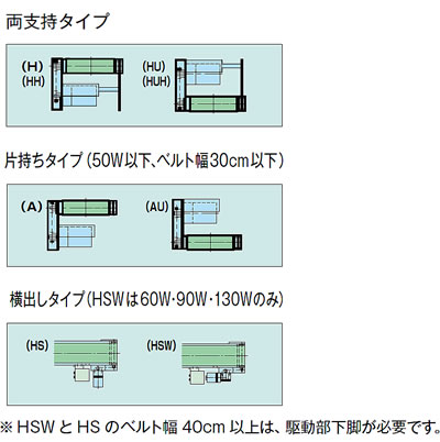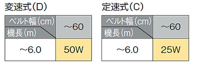 | ■標準出力表 下表は10kg/全長、15m/min時(30m/min以上は変速130W・定速90W) ![]() ■ドライブ種類 ![]() ■仕様表 ※品番記号例を参考に、ご希望の用途に合ったサイズ・仕様を下記から選択して品番を作成し、 メール かFAXでお問い合わせください。
