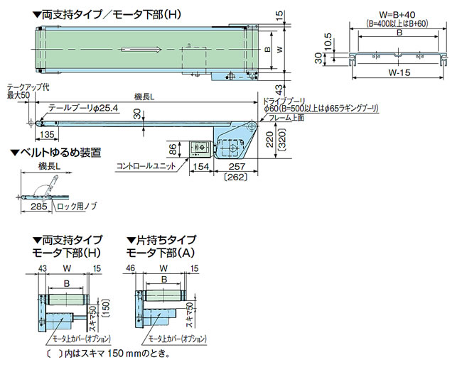 ※2:脚・コントローラ装着時の機長。0.1m単位まで指定が可能です。機長L≧ベルト幅B×1.5で選定(蛇行レスはL≧B)、ベルト幅05、07は機長4m以下。 ※3:A・AUは50W以下でベルト幅30cm以下、HSWは60W、90W、130Wのみ。HS・HSWはドライブ下脚が必要です。 ※4:速度は条件により変動します。より正確な速度が必要なときは、変速式を選定 ※5:標準出力表参照 ※6:太字が標準速度。上限以下の速度を選定、スピードコントローラ変速(V)も製作可。変速式は最高速度表示。 ※7:Rが標準。逆転で使用する場合、搬送物質量や使用条件によっては、十分な搬送能力を確保できない場合があります。 ※8:Gが標準 ■寸法図 ●電源ケーブル3m 付(単相100V =プラグ付) 単相200Vはプラグなし、三相200Vはブラシレスモータ/プラグなし、インダクションモータ/リード線まで。 ![]() |