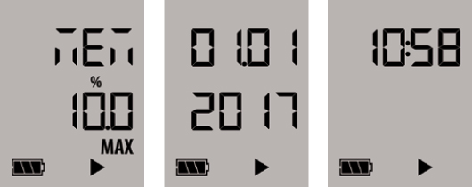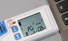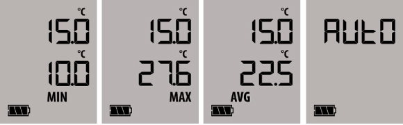 ■表示画面 ●オートモード設定で3秒毎に表示を切り替えます。 ![]() ●メモリー容量と日時 計測中にスタートボタンを押すとメモリー使用量と日時を表示します。 ![]() ●モードボタン:最小値・最大値・平均値 モードボタンを押すと、最小値、最大値、平均値に表示を切り替えます。 ![]()