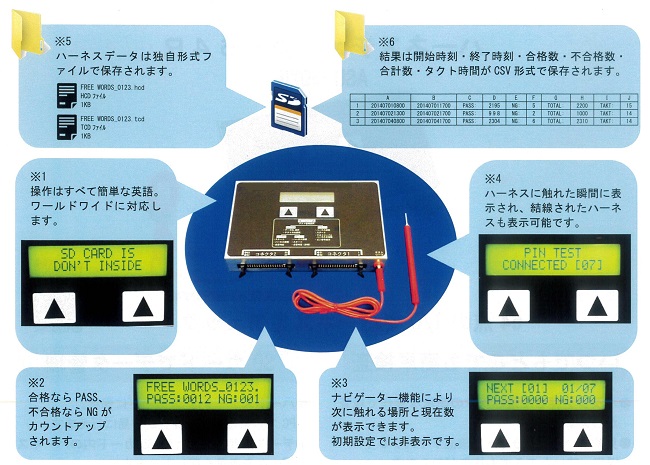 ■特長 ●ボタンを押して選ぶだけの簡単な操作で検査が行えます。 ●見やすいバックライト付液晶ディスプレイ採用。暗いところでも検査が行えます。 ●英語ガイダンス表示の採用により、ワールドワイド対応にしました。※1 ●モバイルバッテリー(別売)に対応。コンセントの無いところでも検査が行えます。 ●本機はすべてのI/Oが入出力を行い検査します。1出力に対する結線も15回路まで分枝可能です。 ●検査品を接続するだけで繰り返し検査。※2 [一括検査] ●付属のテストリードで片側バラ線を1本ずつ検査。※3 [教え込み検査] ●テストリードでハーネスに触れると液晶ディスプレイに番号表示。※4 [ピン番号] ●ハーネスデータはSDカードに保存。PCでの管理、名称変更が容易に行えます。※5 ●データ検索機能により、SDカード内のハーネスデータを素早く探し出せます。 ●検査を終了するとSDカードに結果を保存。トレーサビリティー管理に役立ちます。※6 ●少容量のSDカードでも十分使えます。 (ハーネスデータ容量1件:512 BYTE) (検査結果データ容量1件:73 BYTE) ●使わない時は時計を表示。時間管理に役立ちます。 ●前回の最終検査結果をー発表示。 ●基本機能は充実。不要な機能を省くことにより低価格を実現しました。 ●低価格により資産計上不要、消耗品費としてご購入いただけます。 ![]() ■仕様