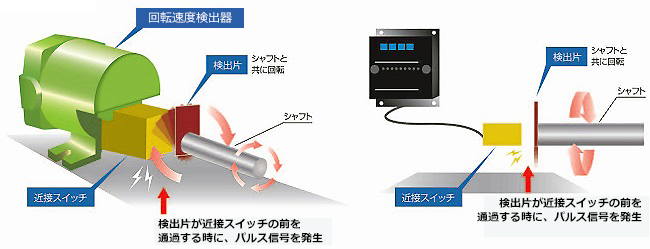 機械装置のシャフトスピードがあらかじめ回転速度検出器によって設定された速度より降下すると、出力リレーが動作しスピード検出となります。回転速度検出器は屋外でも支障なく使用でき、機械装置の回転をカップリングで連結することなく、無接触でスピード検出モーションセンサーです。