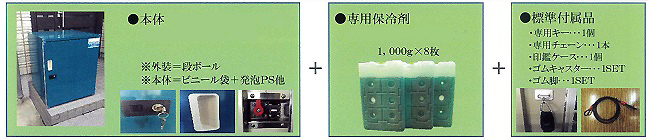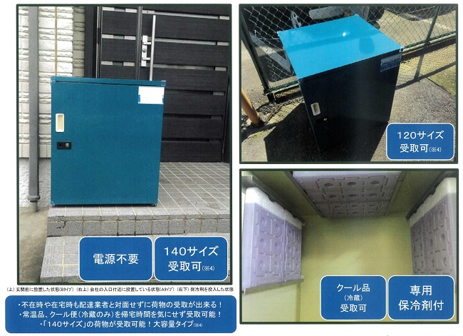 ■特徴![]() ●硬質ウレタン一体成形(モノコック構造)とカラー鋼板で頑丈・強固 メーカー独自の製造法で高い気密性及び堅牢性を確保。衝撃に強い製品が完成しました。 ●組み立て不要、脚を取り付けるだけで使用開始。 ●電源は一切不要、メーカー独自の技術で冷蔵品も受け取り可能 予め冷凍庫で凍らせた保冷剤※1、2を宅配BOXにセット。BOXが予冷されるため、冷蔵庫の代わりに大変身。 ●専用チェーンと専用ロックで盗難防止、キー複製も不可能 付属の専用チェーンを使用し、BOXと柱や重石等などで固定可能。キーも特殊キーを 採用しており複製は出来ません。 ●独自の専用ロック&キーを採用、受け取りも取り出しも簡単操作 荷物を入れて、擦印し、レバーを倒して、最後に扉を閉めるだけ。受取の際はキーを入れスライドして扉を開けることができます。 ●宅配ボックスとしてはもちろん、保冷庫や金庫としても活躍。 ■正面図及び受け取り可能サイズ ![]() ![]() ■冷蔵試験結果 ※3 条件:常温(軒下にて)、庫内フリー、保冷剤6枚投入 庫内中心部の温度を計測。 ![]() ■セット品付属品一覧 ![]() ■仕様