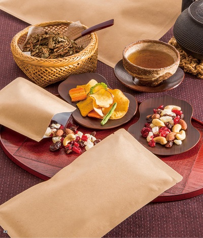 ■特長 ●ナチュラルな雰囲気を演出するクラフト紙を使用しています。 ●遮光性と防湿性に優れ、ガスバリアー性のあるアルミ箔使用。 ●脱酸素剤と併用すると一層保存性が向上します。 ![]() ■使用例 ![]() ■仕様 材質構成:クラフト50g/SPE15/NY15/ドライ/AL7/ドライ/LLD40