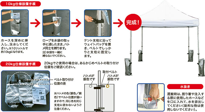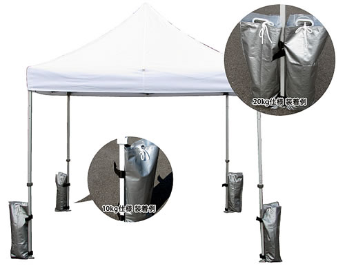 ■オプション ●風邪対策用ウエイト M1624R4-WEIGHT10KG ![]() ・設営したテントの支柱に、それぞれ固定して使用します。 ・重しには入手が容易な水を使用し、ベルトで簡単に支柱に固定できます。 ・一脚につき1ヶ(10㎏)仕様のみでしたが、ベルト位置をずらすことにより、一脚に2ヶ(20㎏)の取付けも可能となりました。 ![]() <注意> ●水を入れて使用してください。(水はお客様でご用意願います。水の注入にはホースが必要です。) ●満杯時の水袋は必ず立ててご利用、保管をして下さい。 ●寒冷地では凍結により水袋に穴が開く場合がありますのでご利用できません。 ●積重ねをしたり、乱暴に扱ったりすると、水袋が破れて水漏れする可能性があります。 ●水漏れが原因で器物に損害を被った場合、保証はできかねます。 ●満水時の水袋の運搬は、ウェイトバッグに挿入し、水袋の取っ手を持って行ってください。 ■仕様