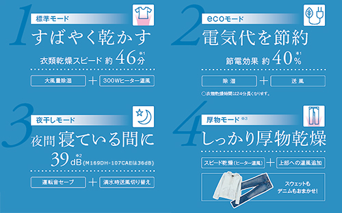 <注意> ※1:M169DH-187CAEにおいて。 試験条件/●部屋の広さ6畳●室温20℃湿度70%●洗濯物2kg相当:Tシャツ3枚、Yシャツ2枚、パジャマ1組、下着7枚、靴下2足、タオル3枚●運転モード[衣類乾燥]運転60Hz地区。 なお実使用時の衣類乾燥時間は使用環境・使用条件により異なります。60Hzの消費電力量比較:衣類乾燥〈標準モード〉550Wh、〈ecoモード〉330Whの乾燥までの積算消費電力量の比較が約40%節電。〈ecoモード〉で運転した場合、衣類乾燥時間は標準モードに比べて24分長くなります。除湿能力も低下します。除湿機の衣類乾燥性能は、一般社団法人 日本電機工業会自主基準(JEMA-HD090)に基づいた条件のもと試験を行った値です。M169DH-107CAEの場合は〈標準モード〉630Wh、〈ecoモード〉350Whとなります。 ※2:本体前方1mで測定、M169DH-187CAEの場合除湿能力は約23%低下します。M169DH-107CAEは約9%低下します。(標準モードに対する夜干しモードの除湿能力低下率)。〈標準モード〉M169DH-187CAEは50dB、M169DH-107CAEは41dBとなります。 ※3:試験機関名:一般財団法人 ボーケン品質評価機構/試験方法:菌~抗菌性試験(試験番号12021853-1)、カビ~かび抵抗性試験(試験番号12016223-1)試験結果:99%以上抑制。 ※4:[ウイルス抑制]当社基準に基づき10年必要量のウイルス抑制剤を添着。/試験機関名:一般財団法人 日本食品分析センター/試験方法:フィルターにウイルス浮遊液を滴下し、室温にて24時間保存した後、ウイルス感染価を測定/試験結果:99.9%抑制/試験報告書番号:第09006877001-01号 試験は1種類のみのウイルスで実施。 ※5:[除菌]当社基準に基づき10年必要量の除菌剤を添着。/試験機関名:一般財団法人 ボーケン品質評価機構/試験方法:JIS Z 2801 定量試験(フィルム密着法)/試験結果:99%以上抑制/試験報告書番号:026255-1、026255-2、030578、026255-4 試験は2種類のみの菌で実施。 ※6:[脱臭]1日タバコ10本(アンモニア、アセトアルデヒド、酢酸の混合ガス)、10年相当分の脱臭効果を検証/試験方法:一般社団法人 日本電機工業会規格(1m3のBOX内における混合ガスの除去性能)にて測定。/試験結果:10年後も脱臭除去率50%以上。 ※7:静音モード時の値。送風量が約38%低下します。標準モード38dB。 ※8:運転音は本体前方1mで測定 ※9:24時間切り忘れ防止機能により24時間で運転が停止します。 |