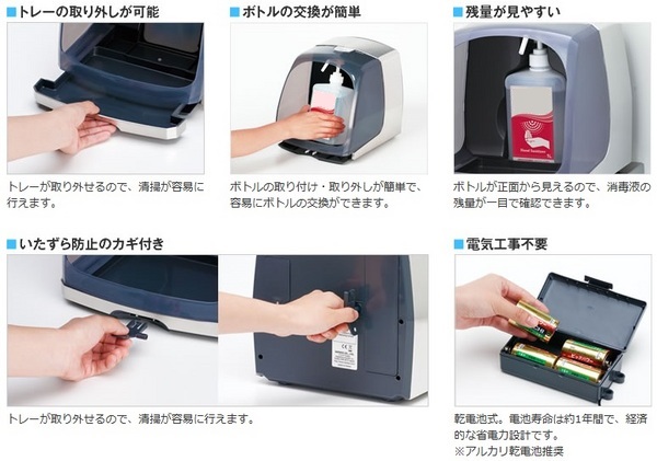 | ■使用方法 ●M1770HD-N1033S フード内のノズルの下に両手を揃えて差し出すと、消毒液が噴射(吐出)します。 ●M1770HD-N1034S 消毒液の噴射(吐出)後、自動ドアへ信号を送ります。 ■特長 ![]() ●センサー感知で手指消毒用アルコールを噴射・吐出します。 ●薬液ボトルを設置するだけで、簡単・清潔にお使いいただけます。 ●アルカリ乾電池単1型4本使用(※電池、薬液ボトルは含みません。) ●消毒液 噴射量=約1.5mL/回 ●自動ドア連動機能は本製品と自動ドアを連動させ、一定時間消毒を行わなければ自動ドアを開閉できないようにする機能です。(M1770HD-N1034S) ■その他特長 ●フード内に手を入れるだけで噴射・吐出しますので、消毒液が確実に手に取れます。 ![]() ●フードとトレーが、消毒液噴射時の周囲への飛散を防ぎます。 ![]() ●乾電池式なので、コンセントのないところでも設置可能です。 ![]() ■仕様