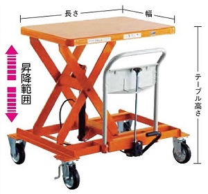 | ■特長 ●荷物の重さによって上昇ピッチが自動的に切り替わる油圧式の早送り装置付です。 ●用途:長尺物・大物の運搬・昇降。 ●製造国:日本 ●荷物をのせた状態でテーブルを上昇したままの移動はしないでください。