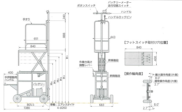 ■特長![]() ●安定感抜群! 高い所もスイスイ作業 ●スピード調節機能 ロータリースイッチでスピード調節ができます。 ●広い作業スペース 400×840mm の作業台 手すりを標準装備で安全設計 ●梯子と手すり 作業台の高さを最大にしても安心し て登れるよう、梯子と手すりを完備 ●昇降レバー高さ調節が簡単 女性でも作業しやすいよう長い昇降レバーとガスダンパーにより、作業台の重さを軽減しています。 ●家庭用コンセントで充電 8時間の充電でフル充電6時間稼働します ※連続走行した場合 ●作業台の高さは5段階 ガスダンパーで重量を軽減。女性でも簡単に高さ調節が可能 ●エアレスタイヤ エアレスタイヤを使用しているため空気抜けの心配がありません ![]() ■寸法図 [フットスイッチ取付け穴位置] フットスイッチ取付け位置は三箇所あり作業に合わせて組換えることができます。 [操作輪角度] 操作輪の角度は片側最大 8.0°に変更することができます。 ![]()
