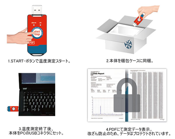 | ■特長 ●USBコネクタを搭載。 ●自動的にPDFレポートを出力。 ●測定インターバル、アラーム温度範囲のカスタマイズが可能。 ●STARTボタンですぐに温度測定をスタート。 ●温度アラームを一目で示すLEDインジケーター内臓。 ●EN12830、FDA21、CFR11に準拠しています。 ![]() ■使い方 ![]() ■仕様