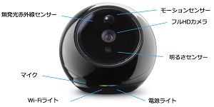 ■特長 ●顔認証 顔を登録することで、通知方法を変えられます。 ![]() ●ダブルで保存 24時間分の映像を、フリークラウドやGoogleドライブに保存できるので、MicroSDカードを紛失しても確認できます。 ●2種類のライト、24時間体制で安全を守ります 前面にLED警告ライトや暗くなってもしっかり撮影できる赤外線ライトを備えています。暗闇の中で起きた異常事態も、すかさず通知します。 ![]() ●アプリで簡単操作 日本語対応の専用アプリで簡単にカスタマイズ。外出先からの操作も自在です。検知有効・無効エリアの指定も感覚的に設定できます。 ![]() ●信頼性の高い暗号化 NASAと同レベルの256bit暗号化方式を採用しています。あなたのプライバシーを漏らしません。 ●双方向通話 双方向通話はクリアで、あなたがどこにいても、スマートフォンから呼びかけられます。 ●異常事態を探しやすいタイムライン表示 撮影した動画のタイムラインをスマートフォンの画面をスワイプすると簡単に確認できるので、異常事態が発生したタイミングをすぐに見つけられます。 ●状況に応じてビデオの画質が変化 カメラの通信帯域に応じてビデオストリーミングを変更します。快適なビデオストリーミングを提供します。 ●リモートパン&チルト&ズーム スマートフォンの画面をスワイプして手動でカメラを動かしたり、ズームにする事ができます。 ●どこにでも設置可能 付属の取付具で壁や天井に設置する事もできます。天井に設置しても動画を天地を変えて表示できます。 ■各部名称 ![]() ![]() ■付属品