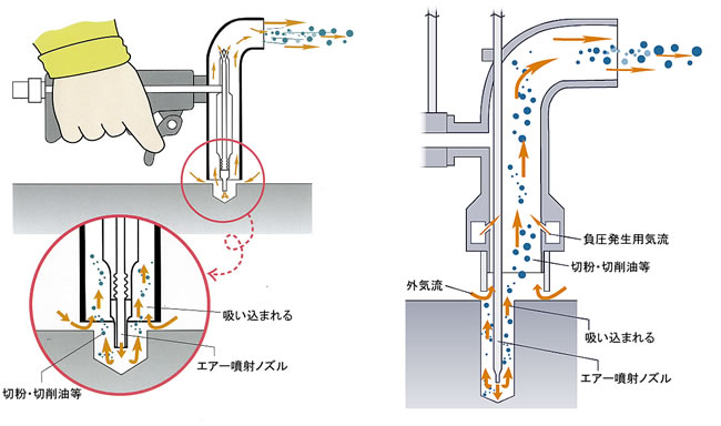 | ■特徴 ●圧縮空気を利用し、加工物の上面の切削粉等を吹き飛ばすエアーガン。 ●噴射ノズル側は、袋穴・止りタップ穴等の切粉・切削油等を吸引・回収し、反作業者側に飛ばし除去するため安全・確実に作業ができます。 ●可動ノズルを上下させながら作業することで、深穴内の清掃が楽に行えます。(M2622F-611S) ※切屑同士が激しく絡み合った状態の場合、吸引回収できないことがあります。 ●「エアー式掃除機 M2622P-72L」と接続し使うことで、オープンスペースでの穴清掃が可能です。 ![]() ■作業方法