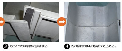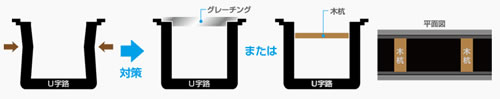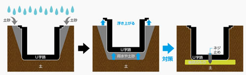 ■施工における注意点 ●浮き上がり 土質の関係などで多量の雨が降った時にU字路の脇から砂などが入り込みU字路が浮き上がる場合があります。 底面外側板状のものを打ち付けると浮き上がりが防げます。 ![]() ●土圧が強い場合 土圧が強い場合U字路の壁面が多少内側に反ることがあります。 その際はスチール製のグレーチングをはめるまたは内側に木杭をはめこむことをお勧めします。 ![]() ●樹脂の性質上、公差が発生致します。隙間ができた場合はコーキング剤など利用して埋めて下さい。 ●10本以上つなげる場合はコンクリート製枡を使用し、熱膨張による収縮を吸収してください。 ●土圧が強いと思われる場合は木杭や鉄製グレーチングをはめ込んでください。 ●U字路脇から多量の用水が入ると浮き上がる場合があります。 |