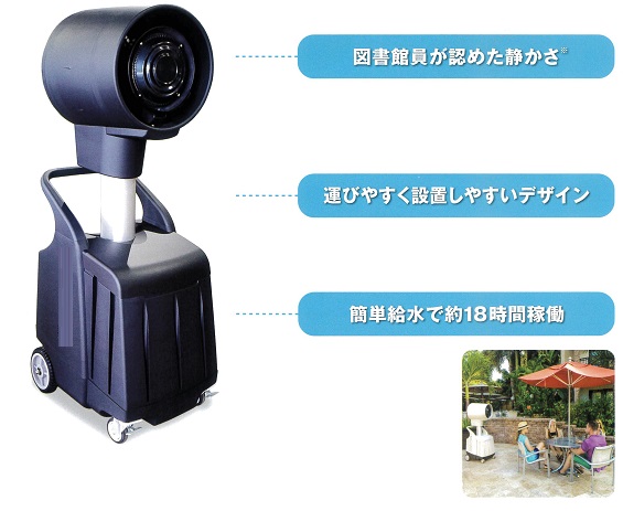 ■シリーズ特長 ●人はぬらさず空気だけを冷やします。 メーカー独自の噴霧テクノロジーにより粒子径の小さいミストを生成し、素早く蒸発するためドライな冷房効果が得られます。洋服が濡れて汚れることもありません。 ミストなしで送風だけでも利用可能です。 ●家庭用電源でも運転可能です。 100V仕様もラインナップ。200V電源の用意がない場所でも心配なくご利用頂けます。 ●メンテナンスの手間は最低限で済みます。 従来型のようなノズルがないため、目詰まりとは無縁です。 フィルターも使用していないので、フィルター清掃や交換も必要なく、常に清潔な空気を提供することができます。 ●夏場の屋外イベントや室内作業の熱中症対策に効果的です。 ![]() ■大型業務用ミスト冷風扇(首振り機能付) M2641B10A1B-100V、M2641B20A1B-200V ![]() ●最大279㎡まで冷却可能 70度の首ふり機能とジェットエンジンの技術を導入したファンが、広範囲まで効率よく冷却。 気候や環境に合わせたファン速度・水分量の調節は、ボタンひとつで簡単操作。 ●追加給水なしで約5日間連続稼働 378Lの大型貯水タンクを搭載。満水の場合1日10~12時間使用しても、追加給水なしで約5日間可動できるため手間がかかりません。 ●優れた運搬性、保管性、耐久性 頑丈なロック付きキャスターで運搬はラクラク。 首ふりヘッドを本体に収納できるため、使用しない際はより少ないスペースで保管可能。 軍事用に設計されたため、砂・埃・熱・温度など、あらゆる過酷な環境に強い耐久性。 ●ランニングコスト:43.2円/時(契約単価27円の場合) ■大型業務用ミスト冷風扇 M2641GAB10-A01-100V、M2641GAB20-A01-200V ![]() ●図書館員が認めた静かさ 小型モデルながらパワフルな送風機能で、140㎡にわたる幅広い空間を冷却可能。 空軍の技術に着想をえた機械設計により、運転中の音は図書館員が認めたほどの静かさを誇ります。 ※設定風量により異なります。 ●運びやすく設置しやすいデザイン なめらかなロールキャスター装備で運びやすく、簡単にロックできるため、いろいろな場所で容易に設置することができます。 ●簡単給水で約18時間稼働 アメリカ国内の従来型ミストファンに比べ、水の消費量は約1/2のエコ設計(140㎡の範囲を冷却した場合)。 72Lの貯水タンクで、約18時間連続稼働が可能です。 ●ランニングコスト:27円/時(契約単価27円の場合) ■仕様