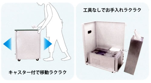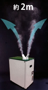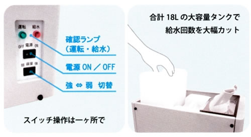 ・1時間あたり約1.2L噴霧 ・タンク総容量18Lで給水レス ・1日8時間運転で約32円 (1kw=25円として計算) ・高性能な銀イオン抗菌剤付属 |