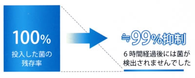 ■毎日使うものだから、使う人のことを考えてつくりました。![]() ![]() ■噴霧イメージ 2つのノズル(噴霧口)は360度調整可。最大約2m高の噴霧で広範囲をすばやく加湿 ![]() ■M2653M-1502Rに付属されている銀イオン抗菌剤の効果(日本食品分析センター調べ) 密閉容器に水・菌・抗菌剤をそれぞれ投入し、一定時間毎に採取、寒天培養後、細菌数を測定しました。 ![]() 大腸菌、緑膿菌、サルモネラ菌、レジオネラ菌、一般細菌でそれぞれ試験を行い、抗菌効果を確認。 また、急性系毒性試験、皮膚一次刺激性試験、変異原性試験を実施し、人体への安全性を確認。 ■仕様