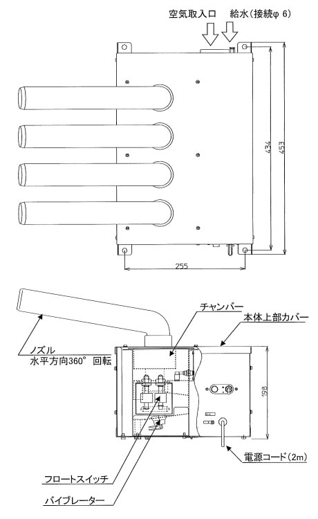 ■各部の名称 この加湿器は、タンク内の水に超音波を照射することにより、平均5ミクロンの霧粒を発生させます。 この霧粒はファンモータによってチャンバー内を均一に拡散し、ノズルより噴霧され、加湿します。 構成はバイブレータ、オシレータ、フロートスイッチ、チャンバー、ファンモーター、電源部(トランス、リレー)、ベース、カバー、ノズル、ケースからなります。 ![]() ![]() ![]() |