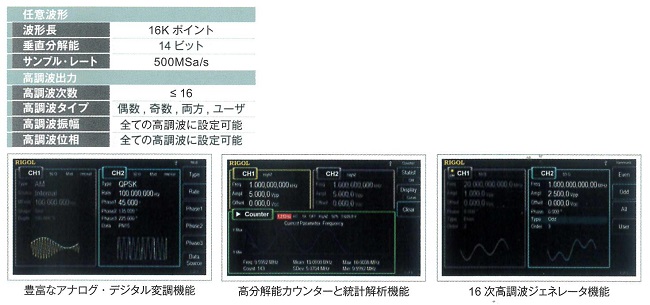■特長 ファンクション・ジェネレータ、任意波形、パルス、高調波、アナログ/デジタル変調、周波数カウンタの機能を搭載しており、モデルによりDC近傍から最高60MHz、さらには200 MHzの幅広い信号エミュレーション・アプリケーションを処理することができます。