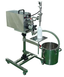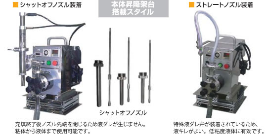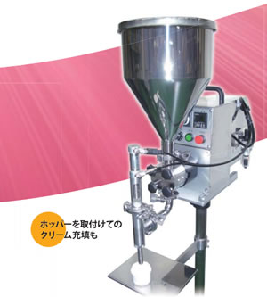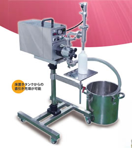 | 液体から粘体まで幅広く兼用できる万能充填機 化粧品、薬品、食品、化学製品などを高精度に充填 ![]() ■特長 ●充填スピードは30本/分と高能力。(但し充填量、液質により変動) ●様々な液質の製品を理想的に充填することが出来ます。 例えば、シャンプー、リンス、ローション、ジェル、ソース、ドレッシング等、化粧品、食品、薬品化学製品液体全般に使用出来ます。 ●一回で5cc~大容量(3000cc)の広範囲な充填が行えます。 ●床置きタンクからの直引き充填が可能 ![]() ●ホッパーを取付、ポンプを逆転させる事により、粘度の高いクリーム状の物も充填出来ます。 ![]() ●シャットオフノズル(オプション) 充填制度と液ダレ防止を高めるシャットオフノズルを装着。 様々な種類の粘液物に合わせ先端シャットオフノズルや中間シャットオフノズルなどノズルの形を選択できます。 ![]() ●多品種・小ロット生産に最適 サニタリー構造なので、分解、洗浄が短時間に行えます。 通液部材質はステンレス(SUS316)、PEEK材(高温煮沸対応特殊樹脂)を使用しています。 ![]() ●操作パネル 操駆動モーターにより回転するギヤポンプを電子制御によりコントロールしています。 操作盤上にて充填量、充填スピード、及び間欠時間運転タイマーの設定が簡単に行えます。 フットスイッチによる1サイクル運転と、間欠運転タイマーによる連続運転が行えます。 外部スイッチを設けてる為、自動運転も可能です。 ![]() ■寸法図 ![]() ■仕様