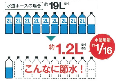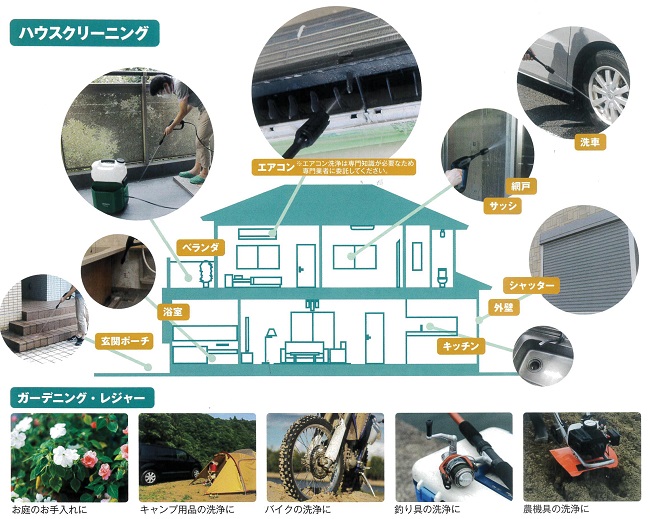 | ■特徴 ●ポータブルタイプなのにパワフル洗浄! 水道圧力の約7倍(水道圧力約0.3MPaとの比較。条件により異なります。) 最大吐出圧力2.0MPa 圧力可変機能付で様々な用途に対応可能! 0.5MPa(ダイヤル1)~2.0MPa(ダイヤル5) ●高効率! ブラシレスモーター採用。 1充電当たりの作業時間(作業時間は参考値です。条件により異なります。) ![]() ※最大吐出圧力 2.0MPa時。(水圧調整ダイヤル5の場合) ●高圧洗浄で節水! 優れた操作性! 1分間当たりの水使用量の比較 ![]() ※4 水使用量は参考値です。条件により異なります。 ※5 最大吐出圧力 2.0MPa時。(水圧調整ダイヤル5の場合) ●優れた操作性! ショートノズルを採用! ワンタッチでホースと接続 ショートノズルで取り回しがよく、さらに本体のポケットにラクラク収納。 作業に必要なもの全てが持ち運べて、機動性も抜群です。 ![]() ●作業に合わせて、直噴から拡散まで調整可能! ![]() ●水道直結や溜め水を使用することで、タンクなしで連続作業が行えます。 ![]() ■使用場所 近くに、水道や電源がない場所でも使える! ご家庭からプロの作業まで、場所を選ばず、簡単に洗浄できます。 ![]() ■仕様
