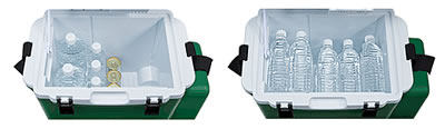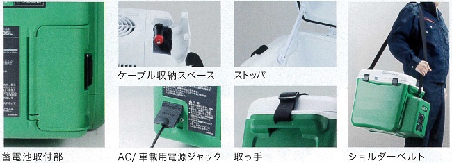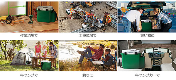 | ■特長 ●大容量25L 2Lなら6本、500mlなら20本。たっぷりの大容量で、保温と保冷が可能です。 ![]() ●冷却・加温機能搭載で、冷温しながら電池充電が可能です。 【冷却性能】外気温に対して約-20℃(最低温度5℃) 【加温性能】外気温に対して約+40℃(最高温度55℃) ※充電中は若干保冷・保温性能が低下します ※保冷・保温時間:約4時間(電池「M308BSL-1860H」1本使用/HIGHモード時) ![]() ●生活防水仕様(防水保護等級IPX4)若干の雨にさらされても動作に支障のでない生活防水構造 ●その他便利機能 ![]() ■使用例 ![]() ■仕様