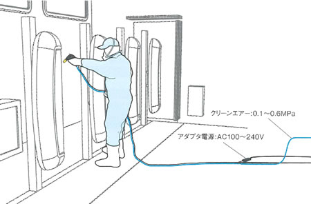 ■特長 ●ホコリを目視できる高輝度LED搭載 ●立作業など、大きな樹脂製品の除電除塵作業に最適です ●消音ノズルで作業環境の騒音を低減 ●15万回の屈曲に耐えるロボットケーブル5m&揺動に強い締め込みコネクタ ![]() ■高圧での吹き飛ばしに最適化 0.4~0.6MPaのエアー圧力で良好な除電能力を発揮します。 ![]() ■除電エリア エア圧:0.6MPa ![]() ■ロングケーブル(5m)で広いエリアで作業できます。 ![]() ■仕様