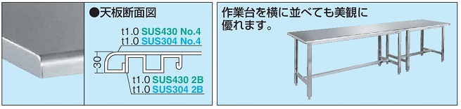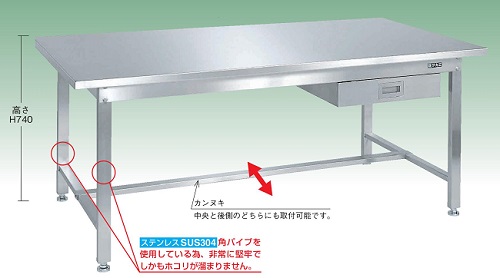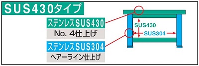 脚部に角パイプを使用したハイグレード高さ調整作業台です。 SUS430、SUS304の2タイプからお選びいただけます。 |
