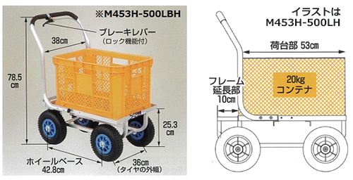 ■特長 ●フレームを延長しタイヤを荷台後方へ取付けたことにより、ハンドルに体重をかけてもウイリー(前方が持ち上がる状態)しにくくなり お年寄りにも安心です。また、ハンドルを前方へ付け替えれば重心位置が変わりさらに安心です。 ●M453H-500LBHは標準でロック機能付ブレーキが付いていますから、下り坂での減速やロックしてパーキングブレーキとしてもご使用できます。 ![]() ※ロック機能付ブレーキは簡易的な機構のため、坂道での放置は危険ですからおやめください。またタイヤが濡れた状態などでは性能が低下しますのでご注意ください。 ■外寸図 ![]() ■仕様