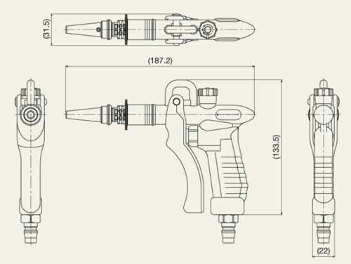 | ■特徴 ●噴射されたエアで跳ね返る切削屑や切粉を、強力なエアカーテンで側方にそらすことができます。 ●小型・軽量ですから女性でも扱いやすくて、疲れにくく、細かな部分の作業も簡単です。 ●樹脂製なので接触しても対象物を傷つけにくいです。 ![]() ■機能 ① エアカーテンの角度調整 先端ノズル部を「締める」または「緩める」ことで、エアカーテンの角度を変えることができます。(標準状態では締まっています) 始めに止めねじを緩め、徐々にノズルを回してお好みの角度を見つけます。角度が決まったら再度止めねじを締め固定してください。 エアカーテンは根元まで締まった状態では広がっており、徐々に緩めることで鋭角になります。(下記図参照) ![]() ② エア流量調節ダイヤル エア流量調節ダイヤル 手元のダイヤルを回すことによって、エア流量を5段階の目印を基準に調節可能です。⇒ 40~330ℓ/min (0.5MPa時) 使用環境、目的に合わせた適切な風量で作業を快適にします。 ![]() ③ 手に馴染んで握り易いロンググリップ グリップのカーブが手に馴染み、持ち易いです。 作業者への負担を減らし、作業能率をアップさせます。 ![]() ■用途 [各種機械の保守・製品品質向上] 加工時切粉・切削屑の除去、乾燥、冷却、梱包のエアー注入など ■寸法図 ![]() ■仕様