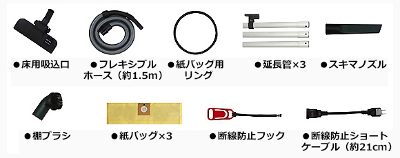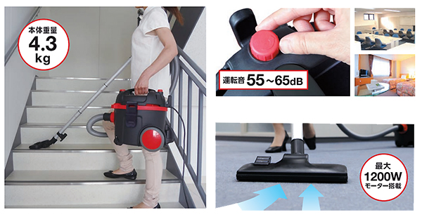 | ■特長 ●コンパクト・軽量 階段の上りや下り、手に持ちながらのお掃除も簡単。また、ハンドル・ノズル部分が軽く、長時間の作業もラクラク。 ●強・弱無段階パワーセレクト機能 オフィスやホテルなど、静かに使いたい時間や場所でも安心して清掃が行えます。 ●最大1200Wのハイパワー設計 ![]() ●電源コードの断線対策機能 ![]() ■付属品 ![]() ■仕様