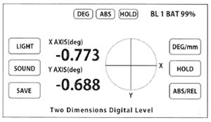 | ■概要 ●2軸同時測定を可能とした2軸傾斜レベルです。 ●大きく見やすいカラー4.3インチTFTLCDを採用しました。 ●角度計と水準器機能をカネタ多用途製品です。(表示単位を角度や傾斜に変更可能) ●簡単な操作でゼロ基準出しと、任意角度でのゼロセットが可能です。 ●測定値を本体に保存し、再表示することができる「SAVE」機能を搭載しています。 ※専用ソフトウェアをPCにインストールすることで、本体に保存された測定値のPCへのバックアップも可能です。 ■主な特徴 表示は見やすい大きさのLCD表示で、傾斜方向は、グラフィックで表示されます ●測定単位は、00.000゜(角度)と000.00mm/m(水平/勾配)の2種類表示が可能です。 ●測定モードは、「絶対測定」と「比較測定」の2機能をボタンで選択でき、また数値をホールド(固定)することもできます。 ●水平度調整(絶対水平度)は、ボタン操作で簡単です(キャリブレーション機能内蔵) ●電源は、充電可能バッテリーを内蔵しております ![]() ■使用例 ![]() ■用途 建築、土木、機器の水平、アライメント、傾き監視、機械装置の組立、精密角度測定、他の多くの分野 ■仕様
