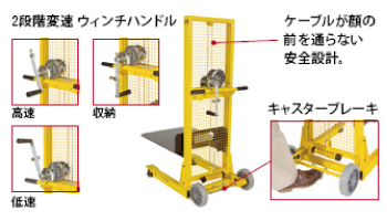 | ■特徴 ●本体高さが1.55mで、車のバックドア内に搭載可能。 ●ワンタッチ操作のキャスタブレーキ付き。 ●大きなトレイで貨物が載せやすい。 ![]() ■2段変速と安全設計 ![]() ■ストラップ シートベルトタイプのストラップが標準付属されており、荷物の転倒を防ぐ。 ![]() ■仕様